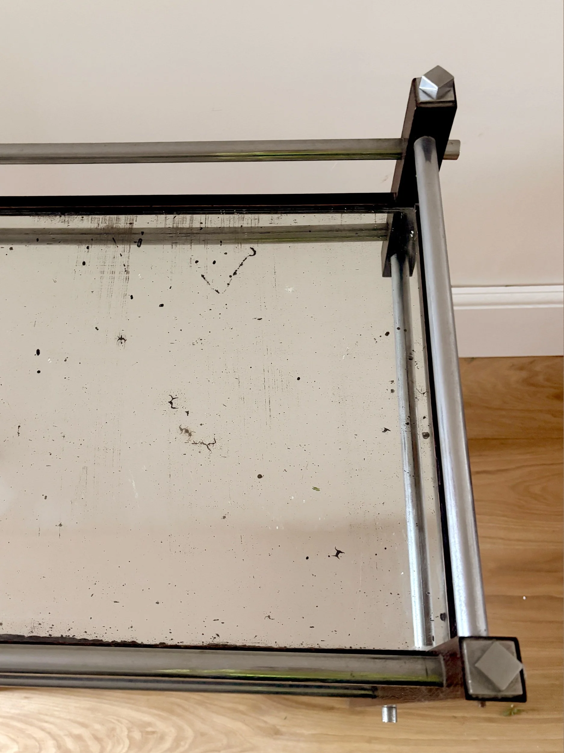 Furniture Categories: All Furniture Lighting Artworks Accessories All / Furniture Mercurised mirror display table with steel rods and corner caps. Mirror has lovely aging to GBP 420.00 Italian 1950’s a chairs, iron, teak, striped velvet. GBP 650.00 Squiggle print post modern chair GBP 540.00