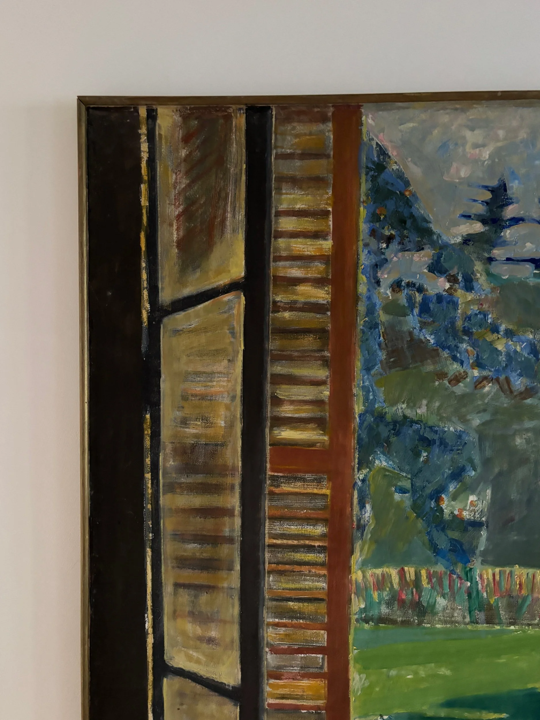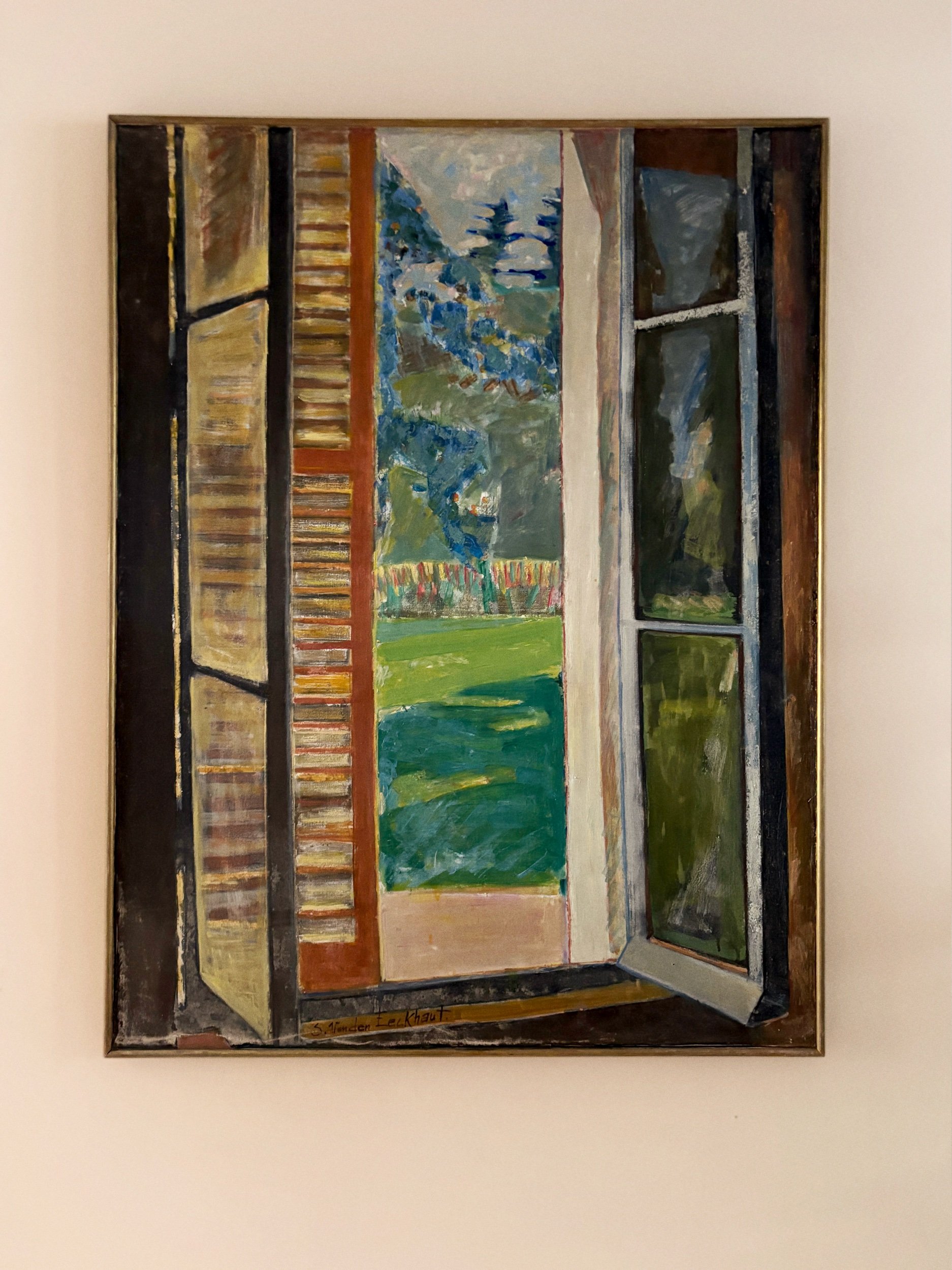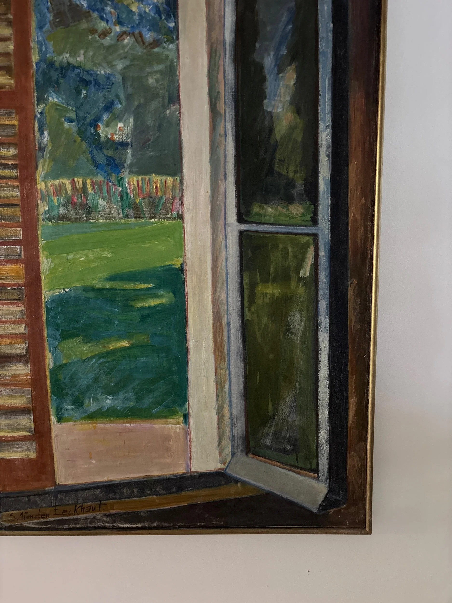 Window view, French oil painting on canvas. Signed bottom right.