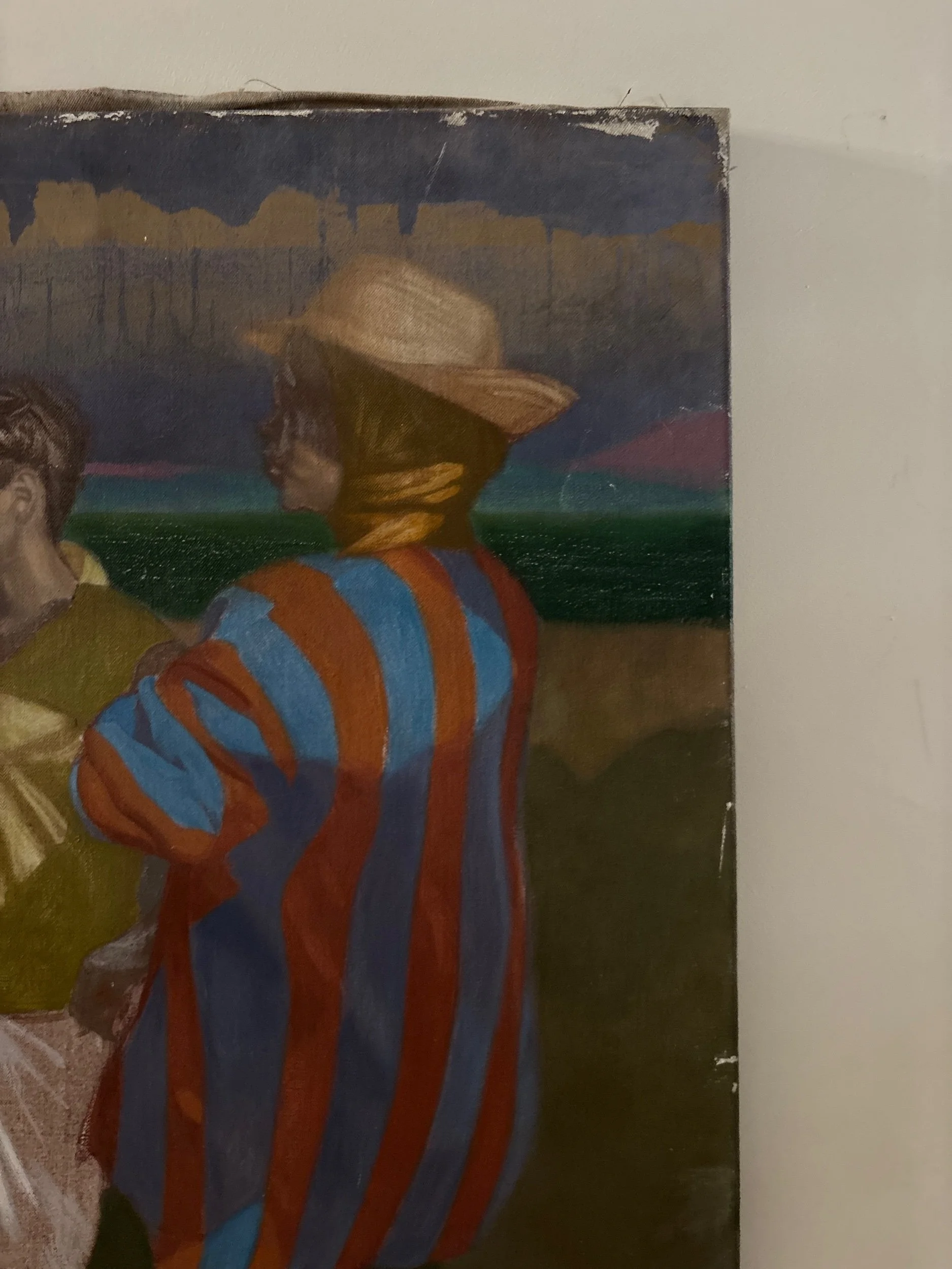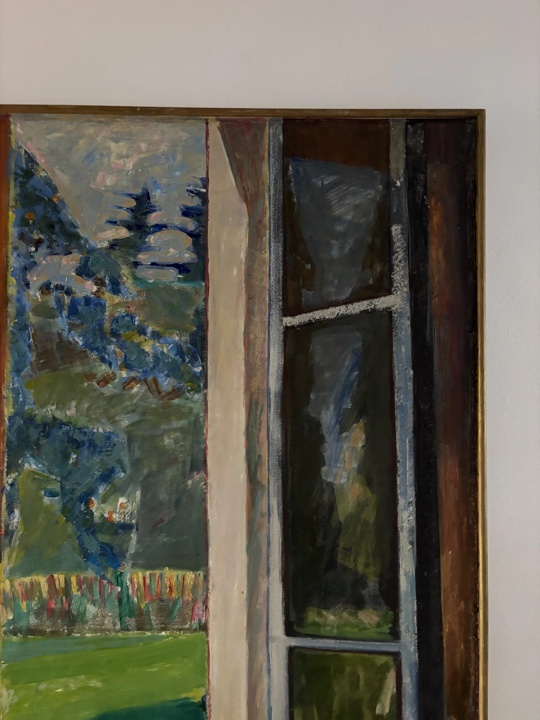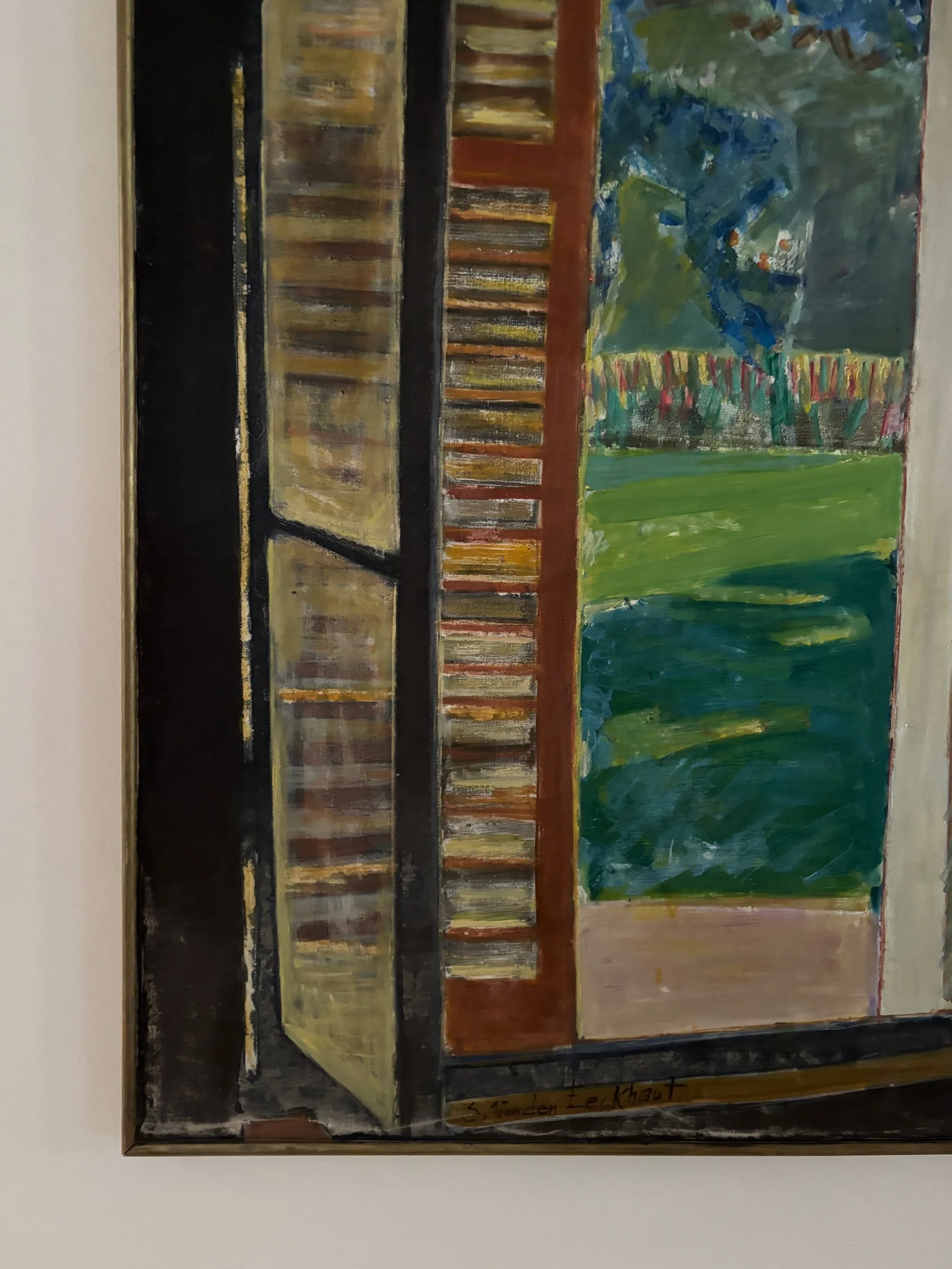 Window view, French oil painting on canvas. Signed bottom right.