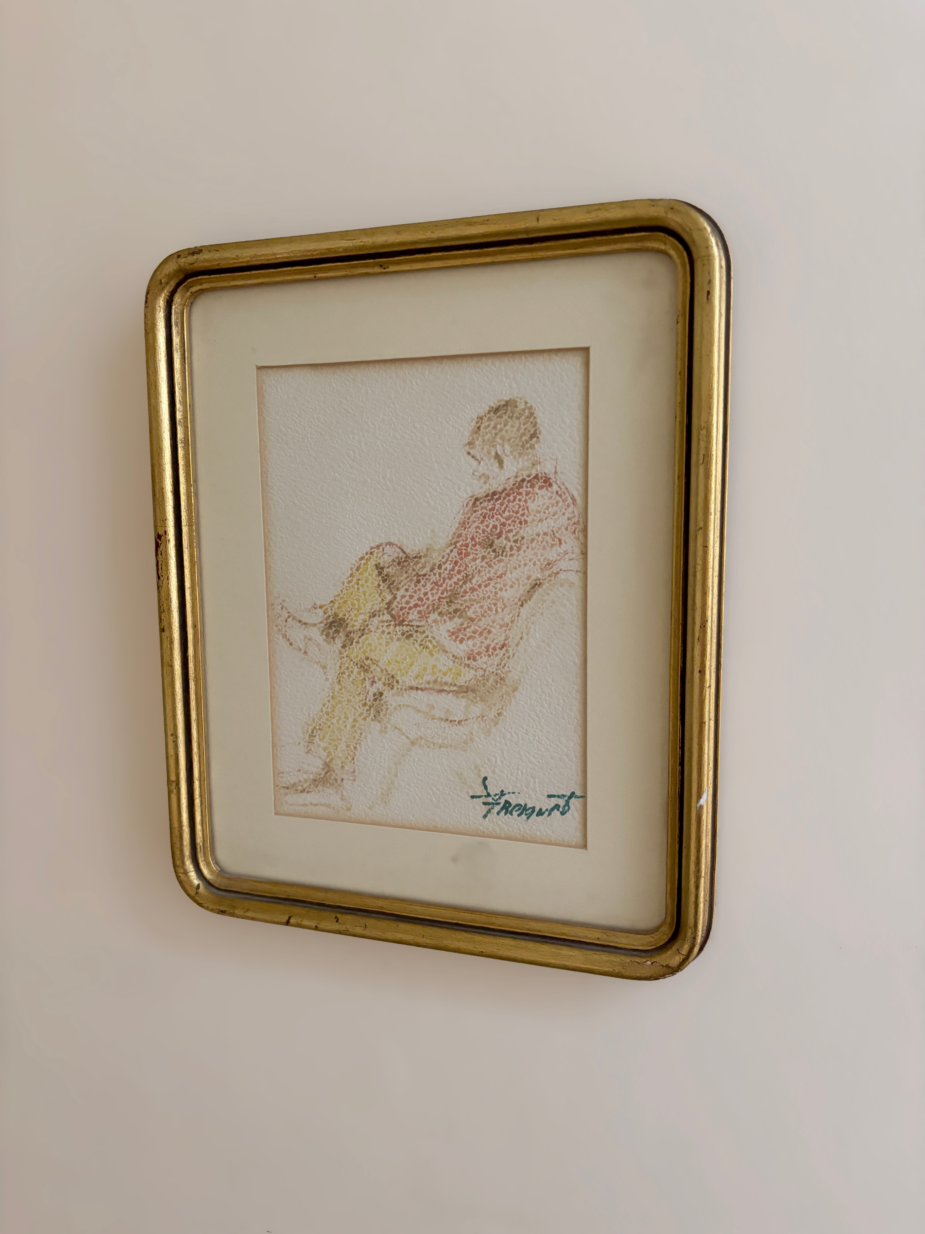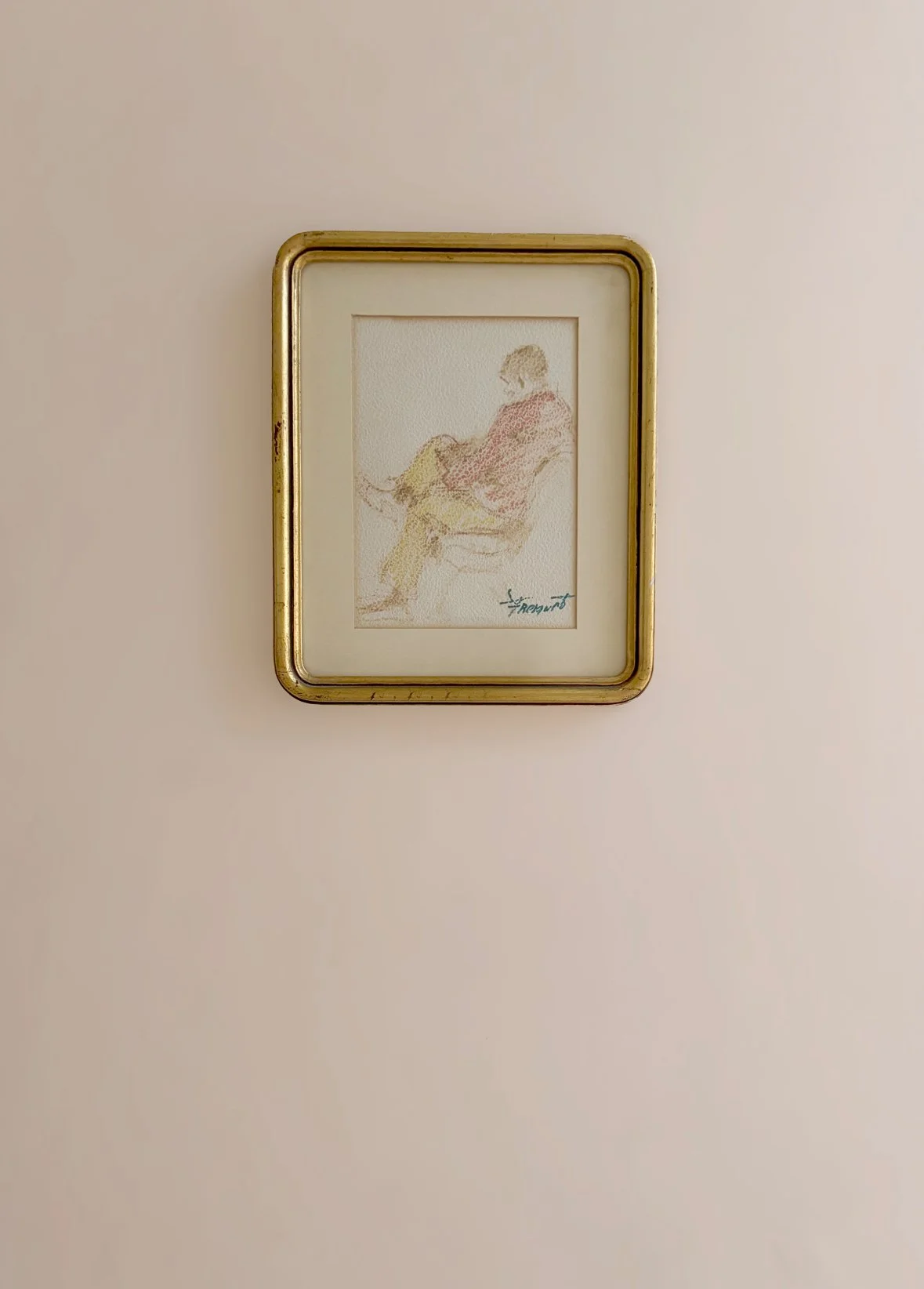 Man reading, pastels on paper with curved edge frame.